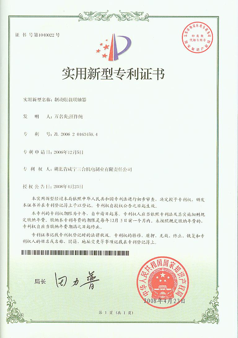 我公司新近研制開發(fā)的三合一減速機(jī)用制動(dòng)限載聯(lián)軸器目前已獲國(guó)家實(shí)用新型專利證書,專利證書號(hào)為:200620163459.4。該專利產(chǎn)品集制動(dòng)器、聯(lián)軸器和限載保護(hù)于一體,它的成功研制將標(biāo)志著國(guó)內(nèi)“三合一”減速機(jī)聯(lián)軸器的開發(fā)達(dá)到國(guó)際領(lǐng)先水平!